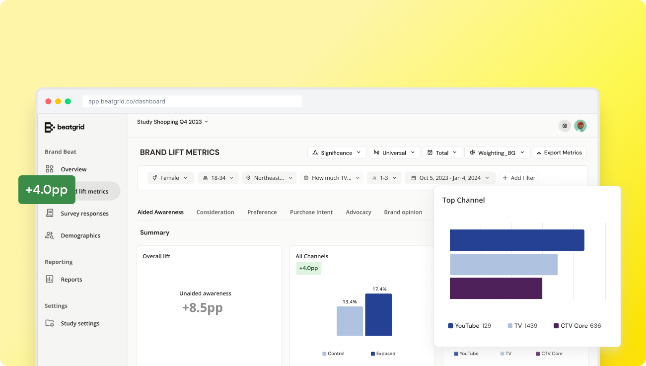 Connect real ad exposure to brand outcomes. Beatgrid links deterministic exposure data to brand lift surveys across CTV, TV, YouTube, digital and OOH.